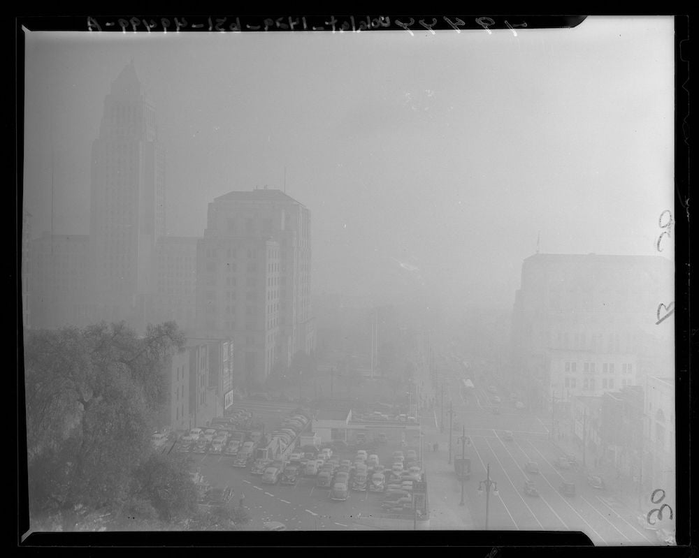 “Smoggy day in Los Angeles, Calif., 1960.” March 23, 1960. Publisher: Los Angeles Times. UCLA Library Special Collections.