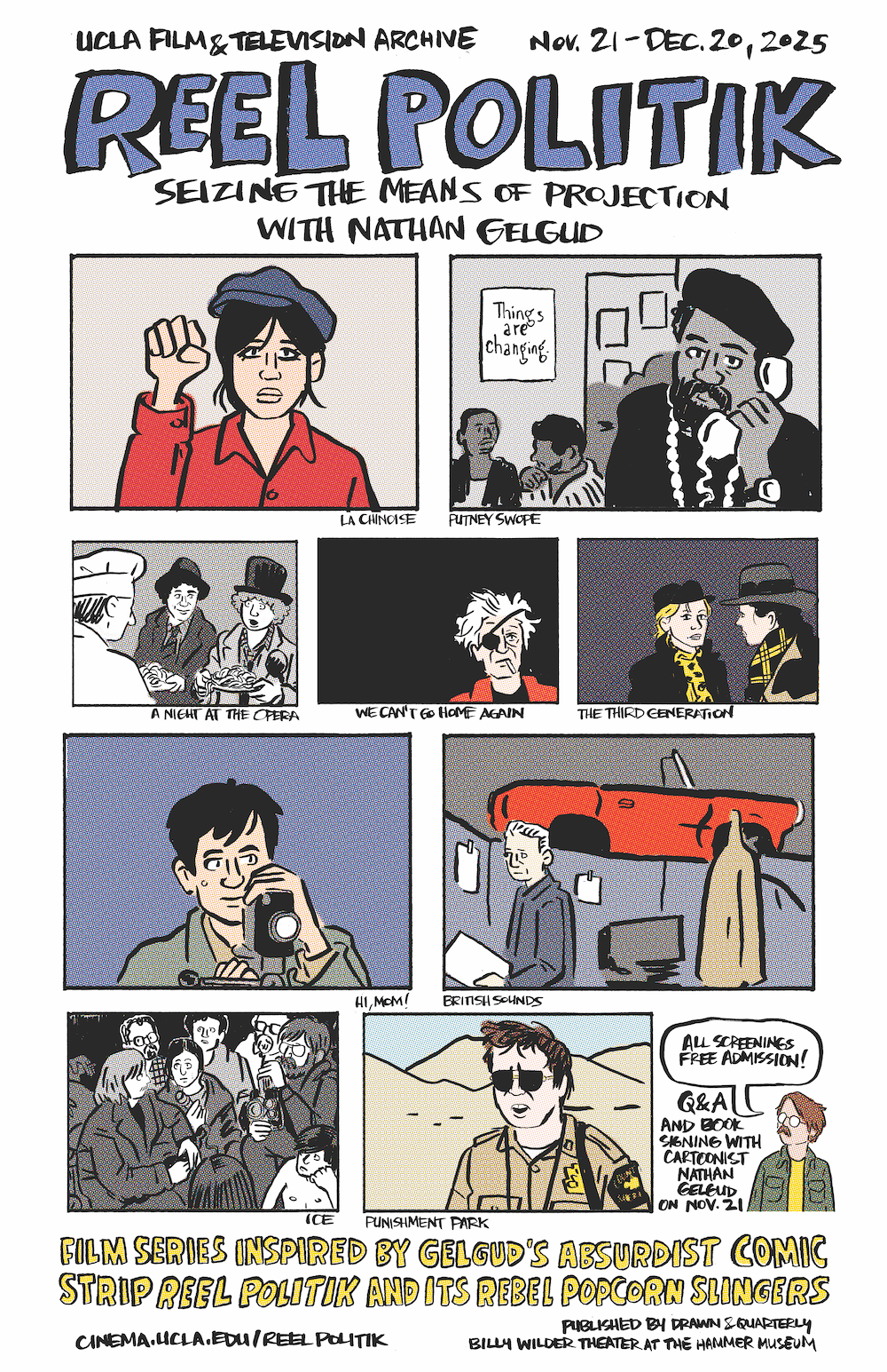Cartoonist and illustrator Nathan Gelgud is probably best known for his series of auteur tote bags, illustrated filmographies on canvas for directors such as Chantal Akerman, Rainer Werner Fassbinder, Yasujiro Ozu and Agnès Varda. Since 2009, when he was commissioned to design a poster for a re-release of François Truffaut’s Small Change, Gelgud’s work has graced cinema ephemera for film screenings and retrospectives at major venues in New York, Paris and Los Angeles. His nonfiction comics about directors and actors have been featured in the New York Times, The New Yorker, Paris Review and Hyperallergic. Lately, Gelgud has turned his attention to Reel Politik, a daily Instagram comic about a ragtag group of cinephile movie theater workers beset by the algorithmic indignities of the streaming age. Gripes about assigned seating and in-theater dining quickly lead to open rebellion when they “seize the means of projection,” then turn their sights on hijacking the Criterion Mobile Closet. Gathered together in a new collection published by Drawn & Quarterly, the Reel Politik strips comprise an absurdist, loving satire of all things arthouse with a Marxist-Leninist twist, an accessible primer on revolutionary thought and a wry, movie-mad antidote for troubled times. The Archive is thrilled to turn over the Billy Wilder Theater to Gelgud for this five-night series of revolutionary films that inspired him and his rebel band of popcorn slingers.