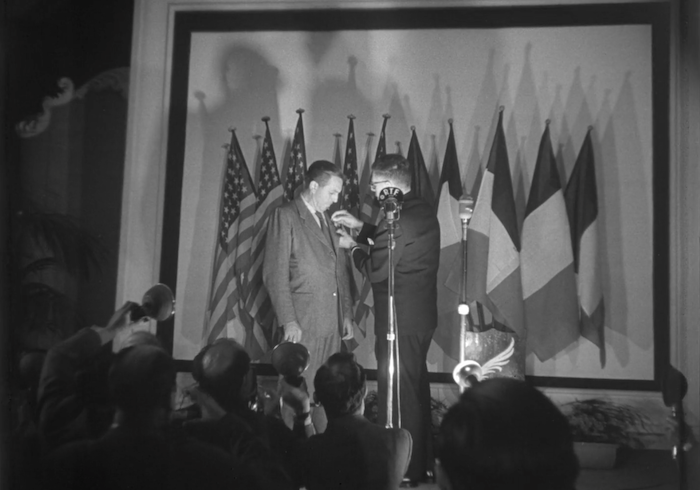 At Cannes, Walt Disney receives the Legion of Honor from French Secretary of State for Information Émile Hugues.