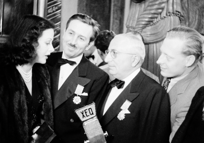 MGM studio chief Louis B. Mayer and Walt Disney are decorated with the Order of the Aztec Eagle, Mexico’s highest honor for foreigners, with Hedy Lamarr and Walter Pidgeon in attendance.