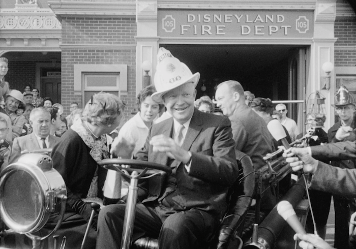 Former President Dwight D. Eisenhower tours Disneyland with his wife Mamie, their son, daughter-in-law and four grandchildren.