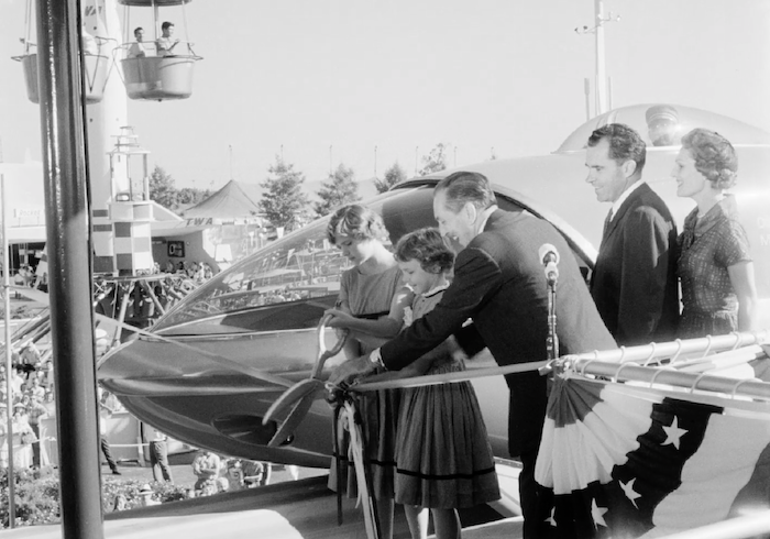 Even future U.S. presidents helped open attractions: actor Ronald Reagan hosted the opening of Disneyland on ABC, and Vice President Richard Nixon and his family visited for the opening of Disney’s new Monorail.