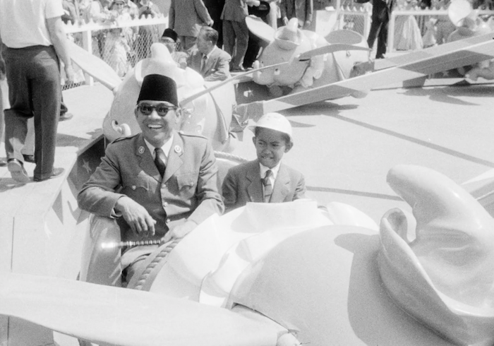 Achmed Sukarno, the first president of Indonesia, and his son Guntur enjoy a day at Disneyland with Walt Disney and Mouseketeers Sharon Baird and Bobby Burgess. Walt entertained many world leaders and important figures, including King Mohammed V of Morocco (1957, watch online: clip 1, clip 2) and Prime Minister Jawaharlal Nehru of India (1961). The footage also includes Sukarno’s tour of MGM studios, where he meets writer-producer Dore Schary and film stars Ann Miller and Robert Taylor.